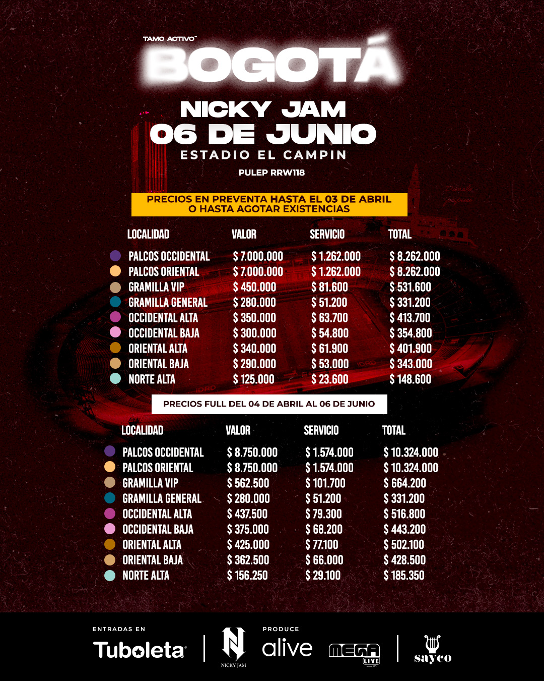 Se informa a los usuarios que los precios de la boletería para cada localidad experimentarán una transición de la Etapa 1 al Precio Full una vez que se alcance y complete el aforo designado para dicha localidad contemplado en la tabla anterior de precios.